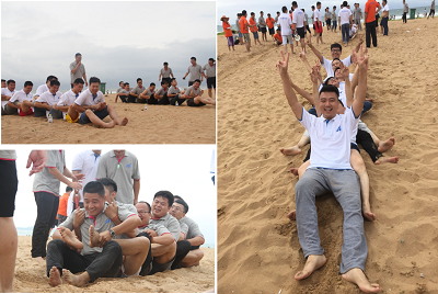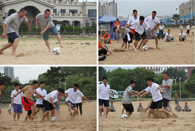 通過前面三個緊張的比賽之后,決出了四個隊伍進(jìn)行終極項目—沙灘足球比賽。比賽中我們?nèi)w成員手拉手圍出了一個足球場,大家既是邊界,又是觀眾,參與感非常強(qiáng)。每一次斷球,都有搶奪競爭對手客戶時的喜悅;每一次傳球,都是團(tuán)隊隊員相互之間的信任;每一次帶球奔馳,都像手握項目漏斗有底氣;最后的臨門一腳,像揮灑汗水拿到了訂單,充滿了愉悅??粗蠹以诮鹕成吓ζ床臉幼?,我們激情高漲,抬頭看了看海的遠(yuǎn)方,心中充滿了愛與喜悅。