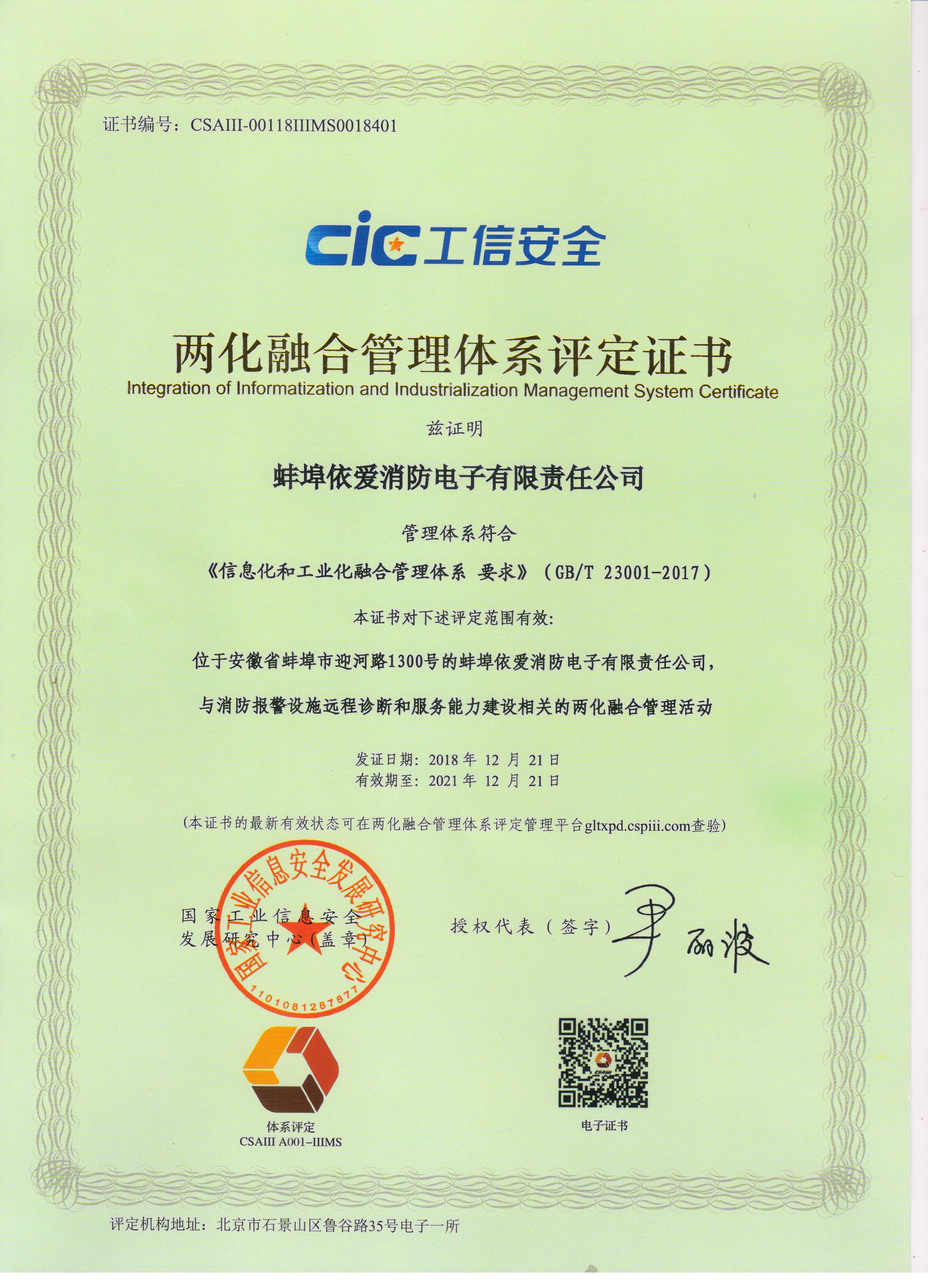依愛(ài)消防兩化融合項(xiàng)目歷時(shí)一年,在公司管理層的指導(dǎo)及各業(yè)務(wù)部門(mén)的大力配合下,最終于2018年12月21日成功通過(guò)國(guó)家工信部審核并獲頒證書(shū)。