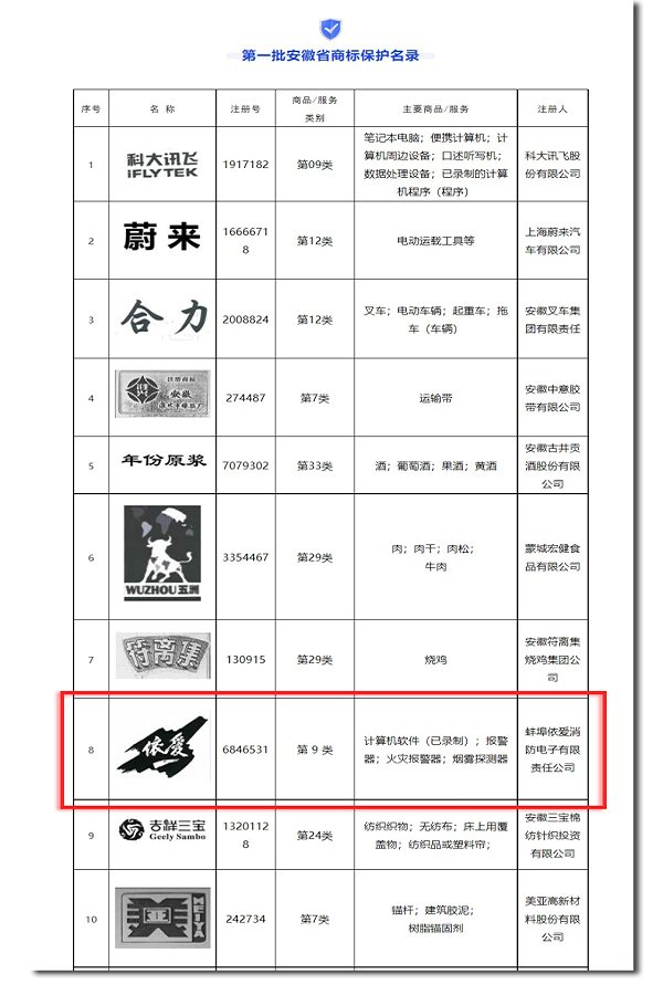 安徽省市場監(jiān)管局發(fā)布第一批安徽省商標(biāo)保護(hù)名錄,“依愛”商標(biāo)榮幸入選